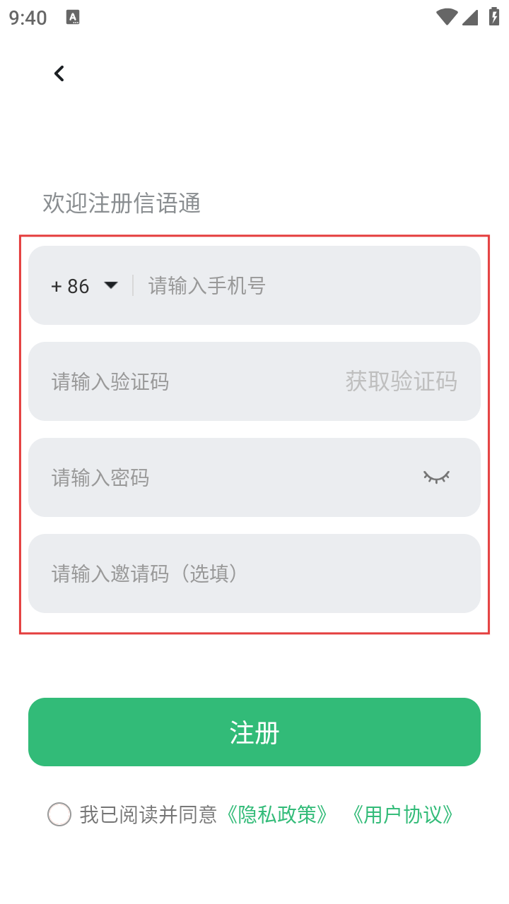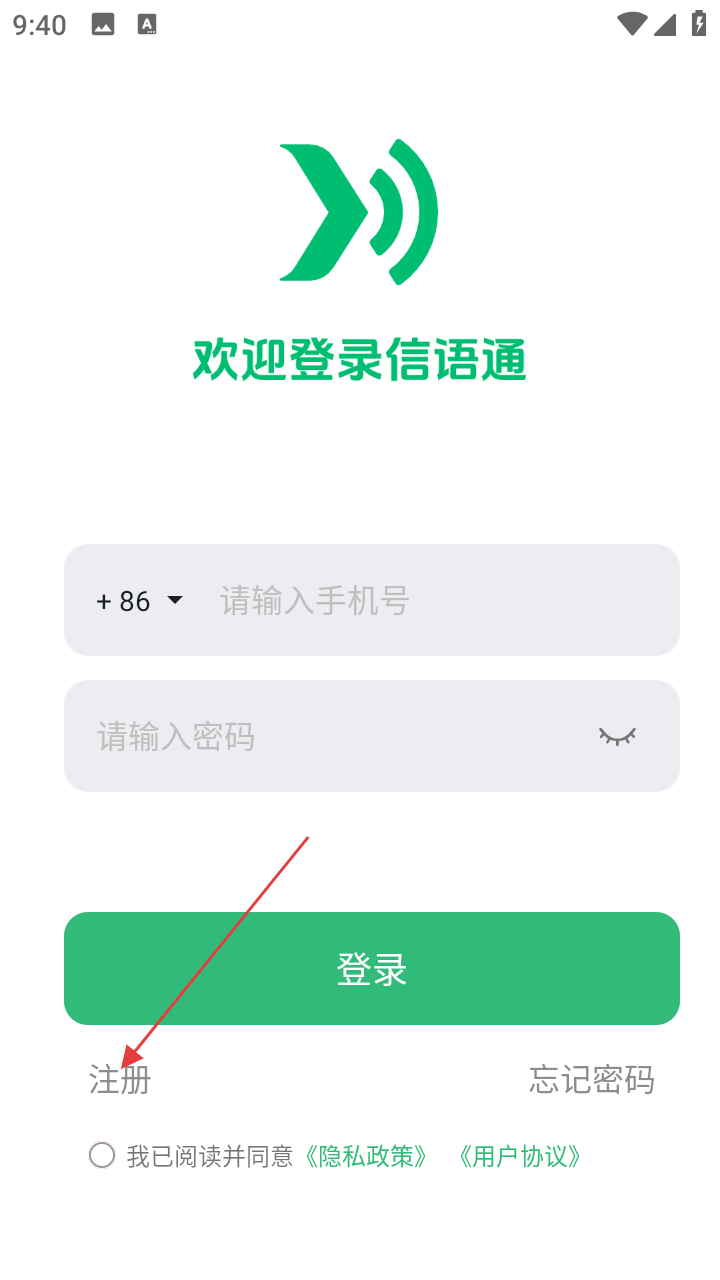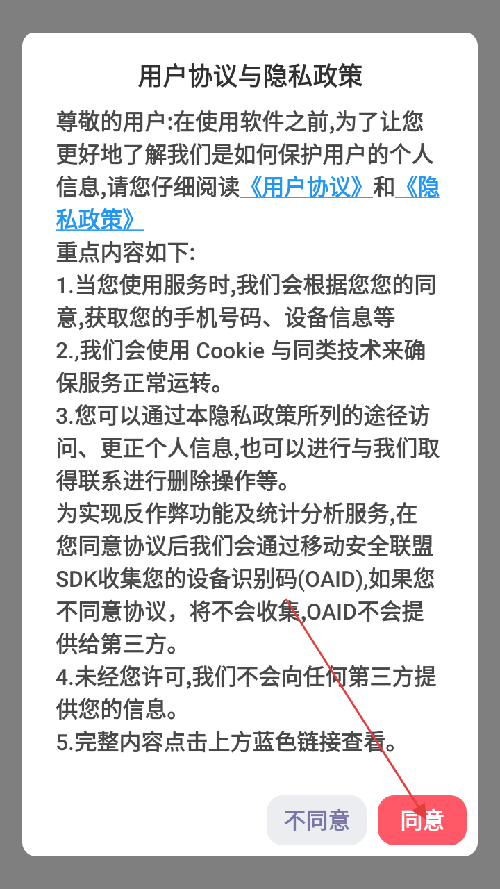 1、使用信語(yǔ)通前,會(huì)彈出用戶協(xié)議與隱私政策頁(yè)面,仔細(xì)閱讀后,點(diǎn)擊【同意】,即可進(jìn)入登錄環(huán)節(jié)。