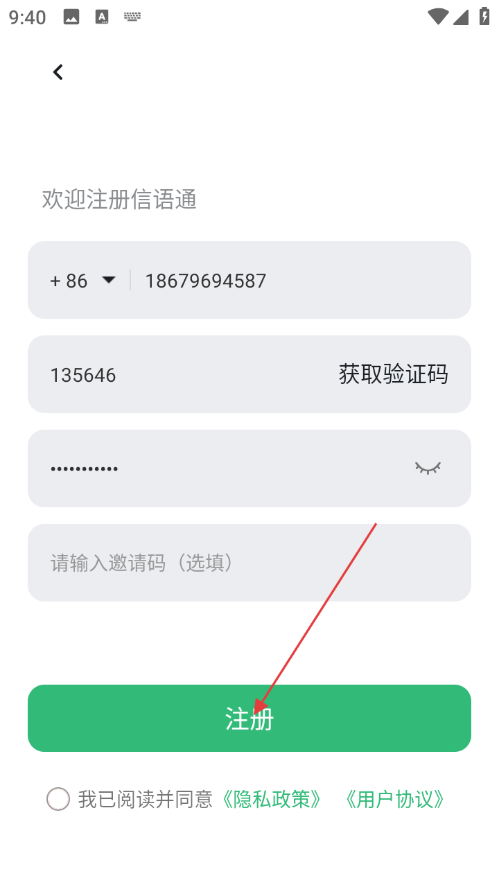 4、填好注冊(cè)信息后,勾選同意隱私政策和用戶協(xié)議,點(diǎn)擊【注冊(cè)】按鈕,完成賬號(hào)注冊(cè)。