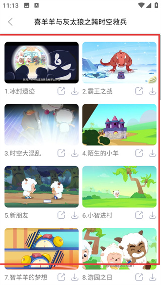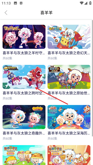 3、在喜羊羊動(dòng)畫列表頁面點(diǎn)擊【喜羊羊與灰太狼之跨時(shí)空救兵】,進(jìn)入該動(dòng)畫的劇集列表頁面。