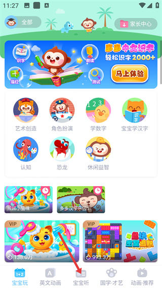 1、在APP底部導(dǎo)航欄點擊【寶寶聽】,進(jìn)入音頻推薦頁面。