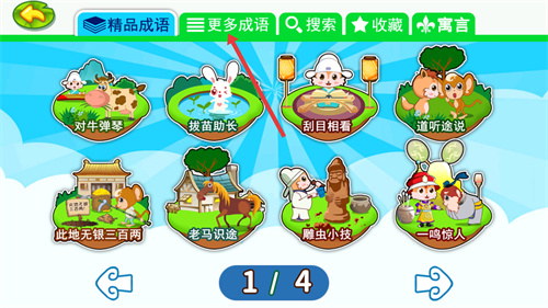 1、進(jìn)入兒童動(dòng)畫成語故事主界面,準(zhǔn)備開始成語學(xué)習(xí)。