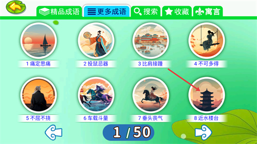 3、在更多成語列表中點(diǎn)擊【近水樓臺(tái)】,進(jìn)入該成語的播放準(zhǔn)備頁面。