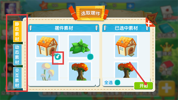 4、在擺件素材選取頁面選擇靜態(tài)、動態(tài)或交互素材后,點(diǎn)擊【開始】,完成故事創(chuàng)作的素材選取流程。