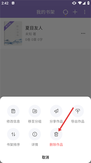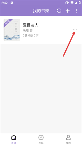 1、在【我的書(shū)架】中找到【夏目友人】作品,點(diǎn)擊其右側(cè)三點(diǎn)按鈕,可展開(kāi)該作品的操作功能菜單進(jìn)行管理。