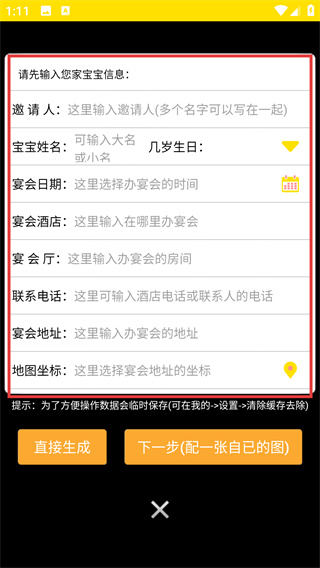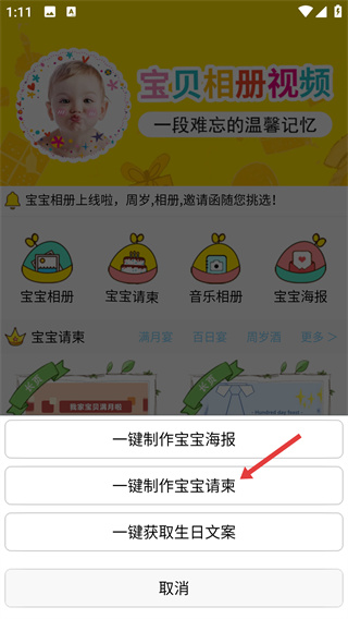 2、在彈出的菜單中選擇【一鍵制作寶寶請柬】選項,進入寶寶請柬的信息填寫頁面,準備完善宴請信息。