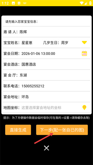 3、在信息填寫頁,需補充【邀請人】、【寶寶姓名】、【宴會日期】等寶寶宴請相關的信息。