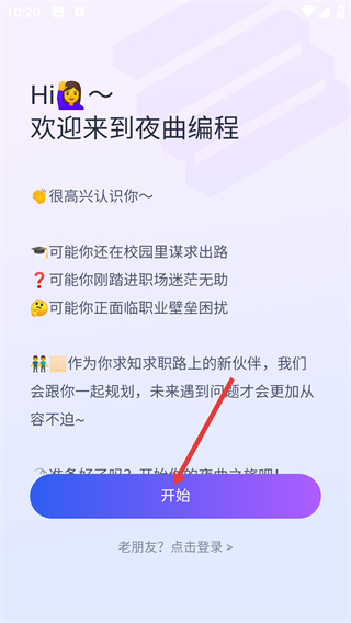 1、進(jìn)入【夜曲編程】的歡迎頁(yè)后,可了解其作為求知求職伙伴的定位,點(diǎn)擊底部【開始】按鈕即可開啟編程學(xué)習(xí)之旅。