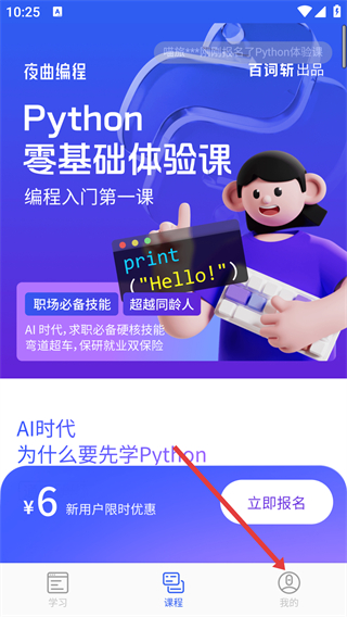 2、在課程頁(yè)可查看【Python-零基礎(chǔ)體驗(yàn)課】的新用戶優(yōu)惠,點(diǎn)擊底部【我的】按鈕可進(jìn)入個(gè)人中心管理學(xué)習(xí)相關(guān)功能。