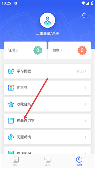 3、進(jìn)入【我的】頁(yè)面后,可進(jìn)行登錄/注冊(cè)操作,還能找到【夜曲自習(xí)室】入口,管理學(xué)習(xí)提醒、優(yōu)惠券等功能。