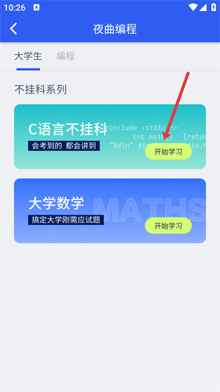 4、進(jìn)入【夜曲自習(xí)室】的大學(xué)生板塊,可看到【C語(yǔ)言不掛科】等課程,點(diǎn)擊對(duì)應(yīng)【開始學(xué)習(xí)】按鈕即可開啟對(duì)應(yīng)內(nèi)容的學(xué)習(xí)。