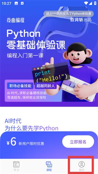 1、進入【夜曲編程】課程頁,可查看【Python-零基礎體驗課】新用戶優(yōu)惠,點擊底部【我的】按鈕進入個人中心。
