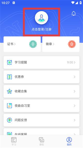 2、在【我的】頁面,頂部有【點擊登錄/注冊】入口,還能管理證書、學習提醒等個人學習相關功能。