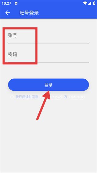 4、選擇【賬號登錄】后,進入對應頁面,填寫【賬號】和【密碼】,勾選協(xié)議后點擊【登錄】按鈕完成登錄。