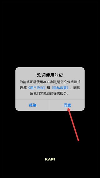 1、首次打開【咔皮】APP,需閱讀并理解《用戶協(xié)議》《隱私政策》,點擊【同意】按鈕以繼續(xù)使用服務(wù)。