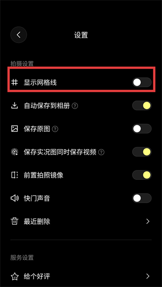 4、在【設(shè)置】頁面的拍攝設(shè)置板塊,可開啟【顯示網(wǎng)格線】等功能,輔助提升拍攝構(gòu)圖效果。