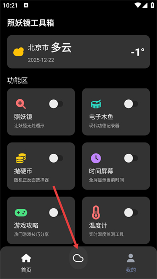 1、在【照妖鏡工具箱】首頁(yè),點(diǎn)擊底部的【天氣圖標(biāo)】,可進(jìn)入天氣查詢頁(yè)面查看對(duì)應(yīng)地區(qū)氣象信息。