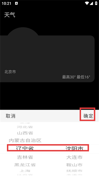 3、在地區(qū)選擇界面,選定目標(biāo)省份(如【遼寧省】)及城市(如【沈陽(yáng)市】)后,點(diǎn)擊【確定】完成選擇。