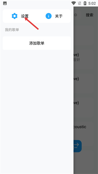 1、點擊界面左上角的頭像按鈕,彈出包含【設(shè)置】、【關(guān)于】的菜單,同時可使用【我的歌單】【添加歌單】相關(guān)功能。