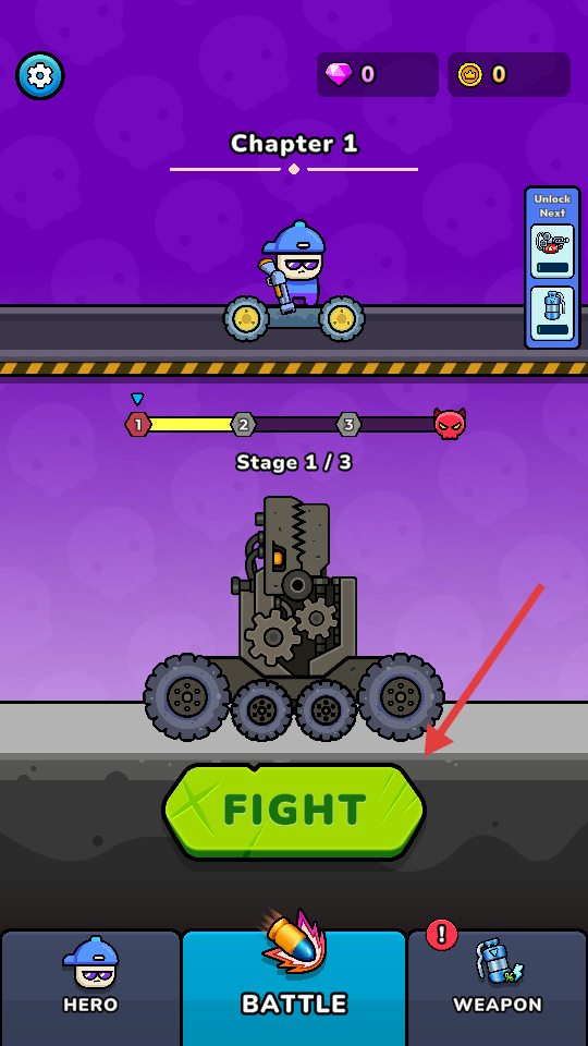 1、進(jìn)入游戲,點(diǎn)擊綠色【FIGHT】按鈕,開啟戰(zhàn)斗。