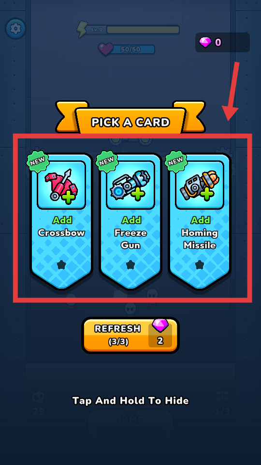 4、經(jīng)驗(yàn)條滿時(shí),在【PICKACARD】界面,可選擇卡牌增強(qiáng)能力。