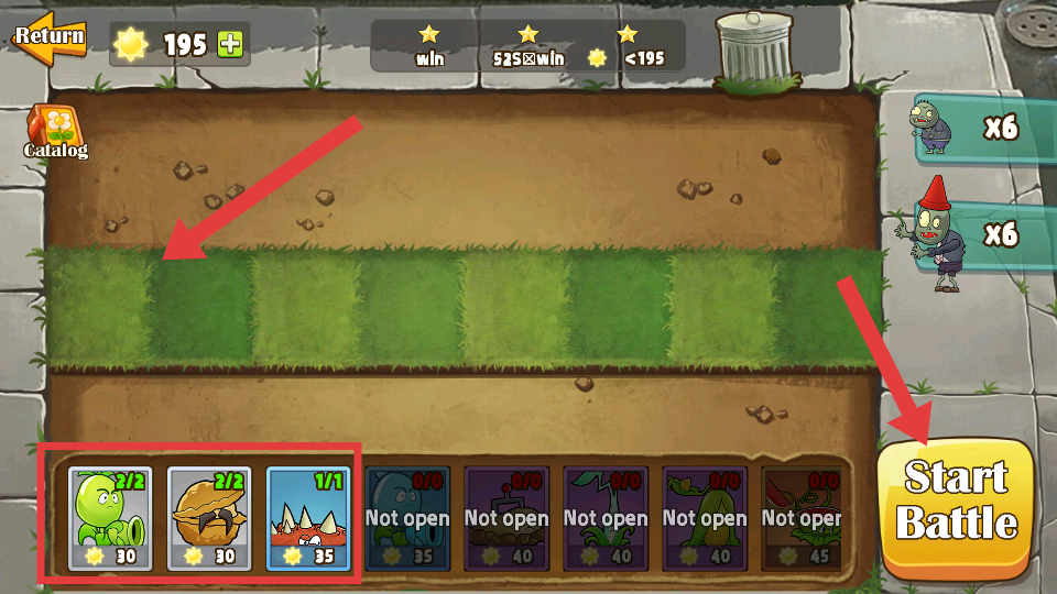 2、進入關卡后,在綠色草坪區(qū)域布置植物,如紅框內的【豌豆射手】【堅果】【地刺】等,布置完成后點擊【Start-Battle】按鈕開始戰(zhàn)斗。
