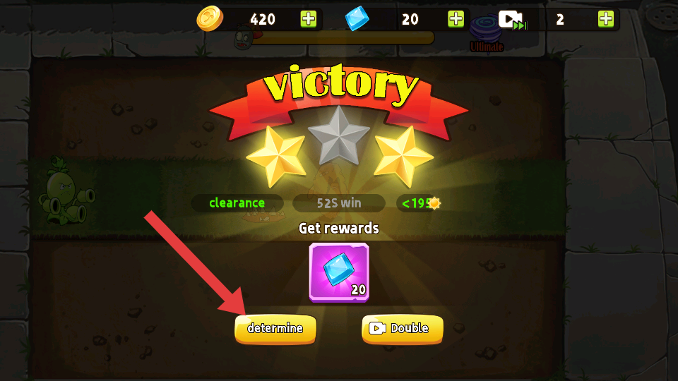 4、成功擊敗所有僵尸后,出現(xiàn)【victory】界面,點擊【determine】按鈕領取獎勵,繼續(xù)挑戰(zhàn)后續(xù)關卡。