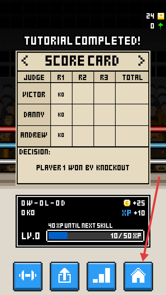 4、完成教程后,點(diǎn)擊右下角房子圖標(biāo)返回主界面,可查看得分卡,還能獲得金幣和XP獎(jiǎng)勵(lì)以提升角色能力。