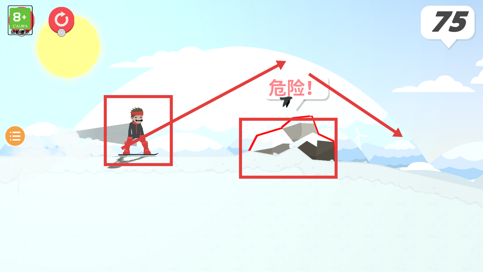 2、滑行時(shí)避開【危險(xiǎn)!-巖石】,控制角色移動(dòng),保持速度,同時(shí)留意分?jǐn)?shù)變化,積累積分。