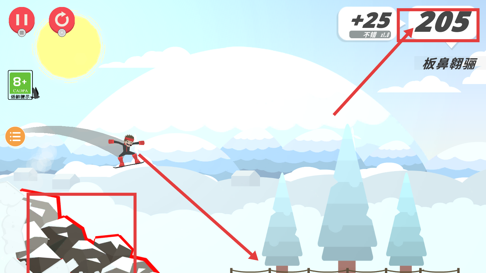 3、躲避【巖石】障礙物,完成動(dòng)作獲取【+25-205】分?jǐn)?shù),持續(xù)滑行提升成績,解鎖更高分?jǐn)?shù)段。