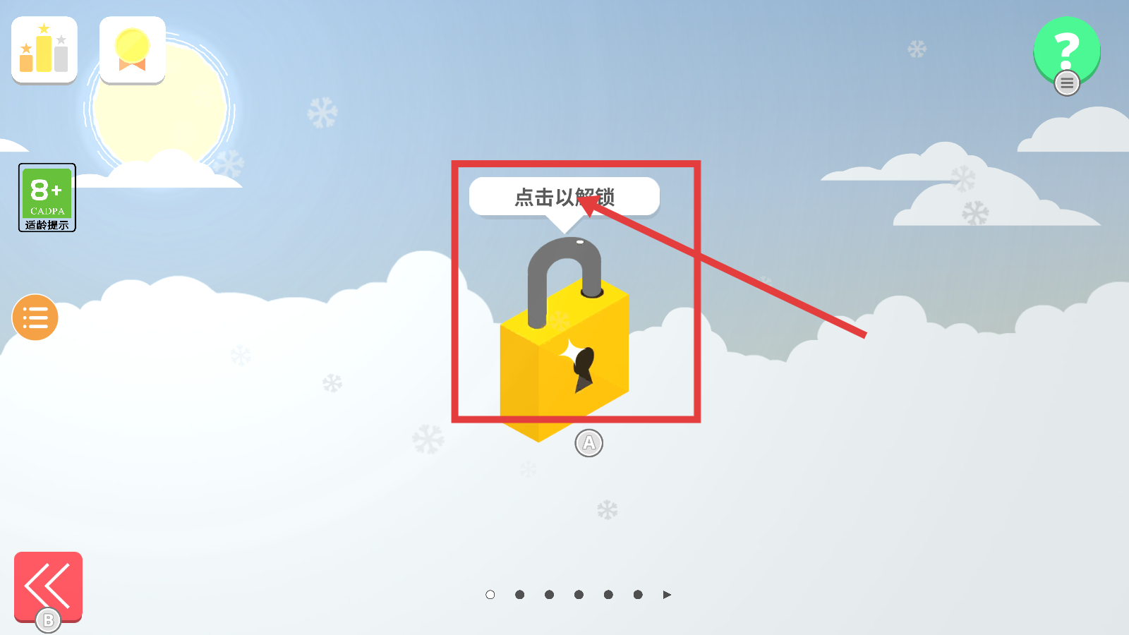 4、關(guān)卡結(jié)束后,點(diǎn)擊【點(diǎn)擊以解鎖】的鎖形圖標(biāo),解鎖新內(nèi)容,繼續(xù)探索滑雪關(guān)卡。