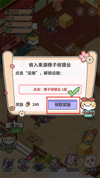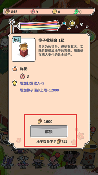 1、解鎖【橡子收銀臺(tái)-1級(jí)】需【1600】橡子,當(dāng)前僅【845】橡子,可先完成任務(wù)積累橡子。