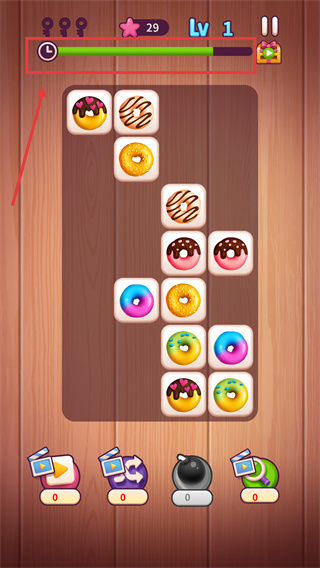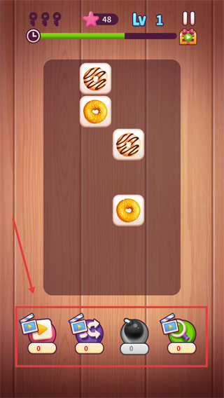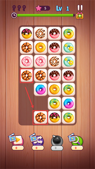4、當(dāng)甜甜圈數(shù)量減少時,利用底部道具欄的功能(如炸彈)輔助消除,快速通關(guān)。