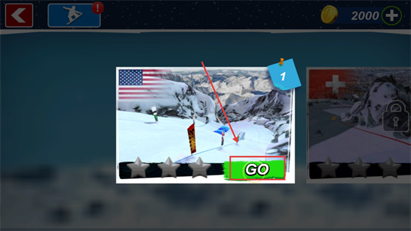 1、選擇解鎖的關卡(如標識【1】的區(qū)域),點擊【GO】按鈕進入滑雪賽事場景,準備開始比賽。