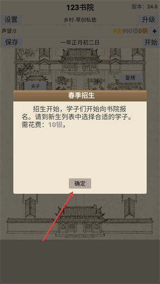2、彈出【春季招生】提示框,知曉需花費(fèi)【10銀】,點(diǎn)擊紅色箭頭指向的【確定】按鈕開啟招生流程。