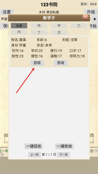 3、進(jìn)入【新學(xué)子】界面,查看學(xué)子屬性后,點(diǎn)擊紅色箭頭指向的【招收】按鈕錄取學(xué)子。