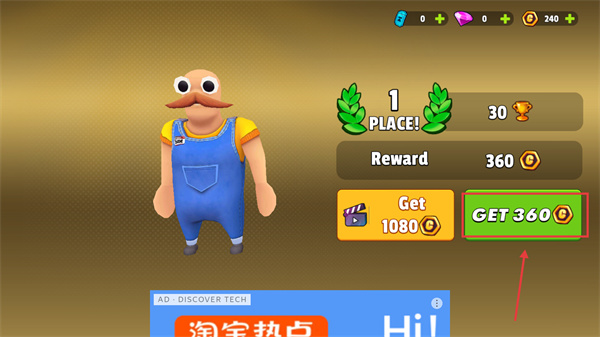 4、獲得【1-PLACE】排名后,點(diǎn)擊【GET-360-金幣】按鈕領(lǐng)取對(duì)應(yīng)獎(jiǎng)勵(lì),積累資源。