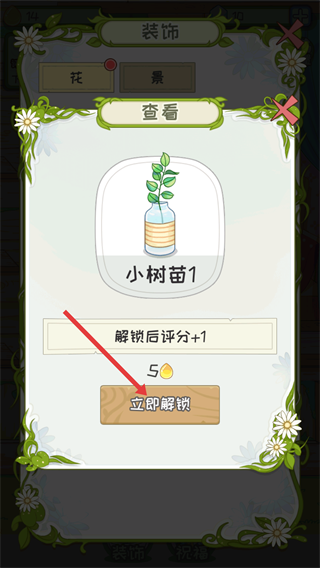 3、查看【小樹苗1】的詳情,消耗5個【太陽花】點(diǎn)擊【立即解鎖】,解鎖后評分會+1。