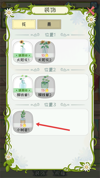 2、在【裝飾】界面找到【位置3】下的【小樹苗1】,選中該裝飾選項(xiàng)。
