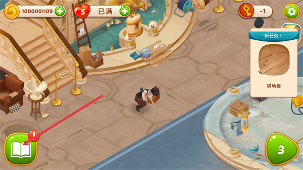 1、點(diǎn)擊【綠色書本】圖標(biāo)查看新任務(wù),通過(guò)三消闖關(guān)獲取【金幣】-【鑰匙】,解鎖【鋪地板】任務(wù)推進(jìn)莊園重建。
