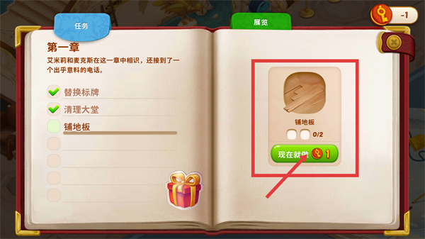 2、在任務(wù)界面查看【第一章】進(jìn)度,點(diǎn)擊【現(xiàn)在就做】消耗1金幣,完成【鋪地板】任務(wù)獲取材料推進(jìn)劇情。