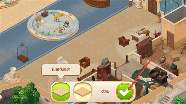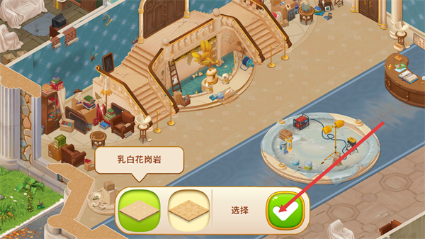 4、確認(rèn)【乳白花崗巖】材質(zhì)后場(chǎng)景更新,繼續(xù)選心儀樣式點(diǎn)對(duì)勾,完成地板鋪設(shè)推進(jìn)莊園重建進(jìn)度。