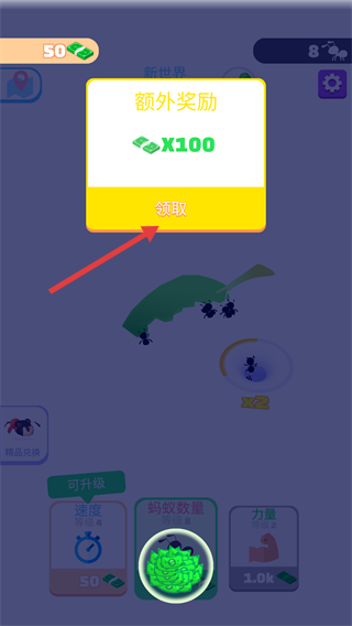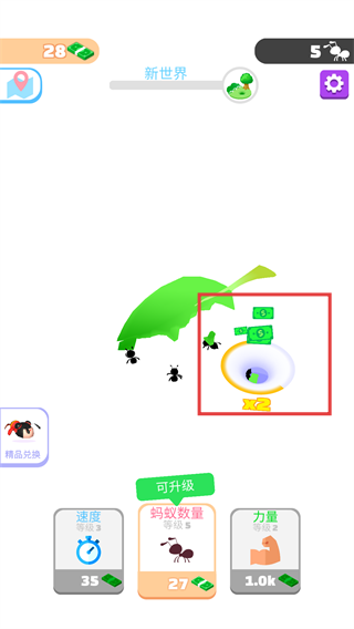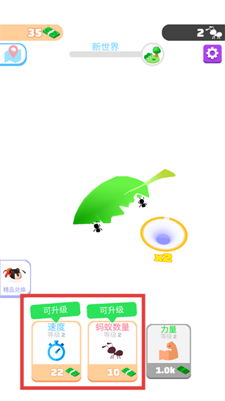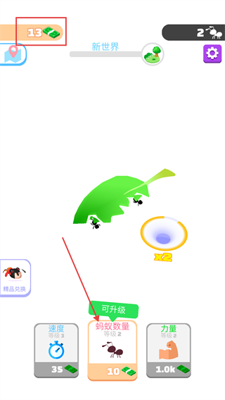 1、查看界面下方【速度-等級2-22】【螞蟻數(shù)量-等級2-10】等可升級項,消耗資源升級提升螞蟻能力。