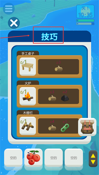 4、打開【技巧】界面,可查看各類物品的制作配方,如用【木材】制作【手工桌子】,推進(jìn)生存建設(shè)。